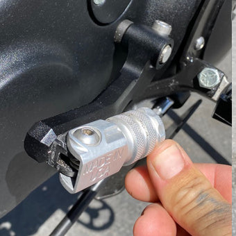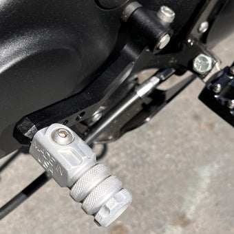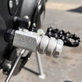 - CNC-machined aluminum shift peg folds up just like on offroad bikes